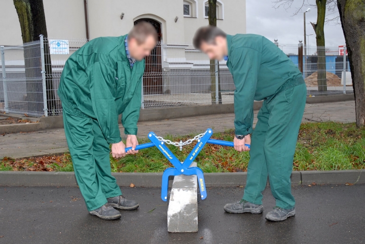 The grab is designed for manual and power-assisted handling and laying of kerbs and other concrete pre-casts up to 150 kg in weight. The jaws are padded with rubber for a better and safer grip when handling. The included chain helps hoisting the grab on excavators and similar power loading machines. The powder coating provides a durable and neat finish.